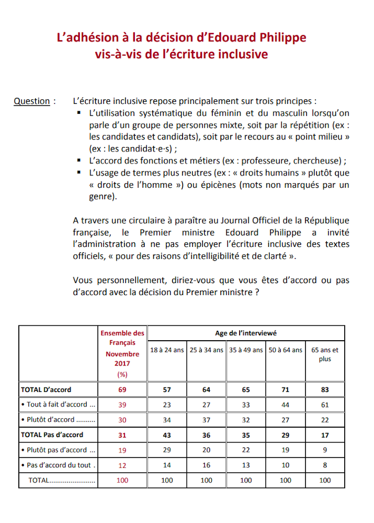 La question qui se pose à la lecture de ce sondage est la suivante : comment interpréter les résultats ? En tant que partisan de l’écriture inclusive (mais pas forcément de l’usage du point), j’aurais pu répondre que j’étais plutôt d’accord avec le premier ministre pour peu que je lise la circulaire en question…