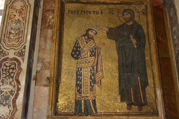 Au Moyen Âge, les souverains chrétiens continuent d’exploiter politiquement la figure du Christ dont ils se présentent comme les lieutenants sur terre. À Palerme, sur une mosaïque de l’église de la Martorana, le roi normand Roger II est couronné par un Jésus en lévitation, spécialement descendu du ciel pour prendre part au sacre royal.