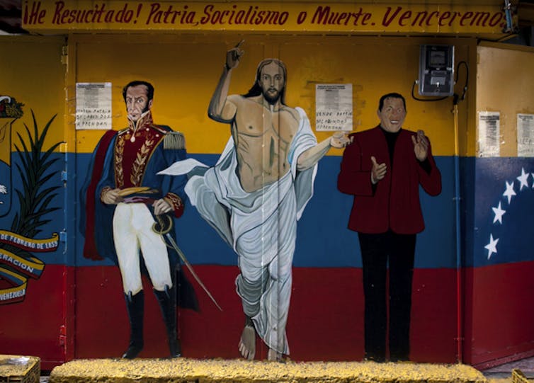 Dans les quartiers pauvres et les campagnes, des peintures de propagande affichent une étonnante trinité politico-religieuse : Jésus, Bolivar, Chavez. Trois figures, trois époques, mais un seul et même combat politique.