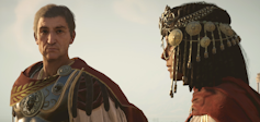 Nous sommes en 49 av. J.-C. La reine, âgée de 20 ans, a été chassée d’Alexandrie par un complot de son frère, Ptolémée. Dans de petites scènes, appelées cinématiques, qui permettent au joueur de comprendre le contexte, la souveraine est vêtue en reine égyptienne, coiffée d’un diadème en or et le cou enserré dans un lourd collier, comme sur les représentations d’elle, sculptées il y a 2 000 ans dans les temples. Mais avec un ajout totalement fantaisiste : deux chaînes en or qui lui tombent sur les joues.