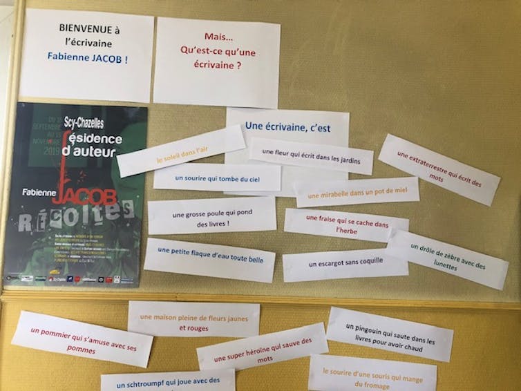 Ce thème automnal et littéraire a ainsi été le fil conducteur de divers ateliers d’écriture proposés aux publics. Les enfants de l’école primaire de Scy-Chazelles se sont initiés à cette recherche sensorielle en dressant une liste de choses qui s’en vont, tandis que les élèves de l’école de Ban-Saint-Martin ont pu expérimenter le dispositif du dictionnaire poétique et ont réservé une belle surprise à l’auteur en réalisant un panneau où ils tentaient de définir le mot « écrivaine ». Dans le lot, quelques perles de créativité : « Une écrivaine, c’est une grosse poule qui pond des livres », « Une écrivaine, c’est une petite flaque d’eau toute belle », « une extraterrestre qui écrit des mots », « un escargot sans coquille », « une fleur qui écrit dans les jardins ».