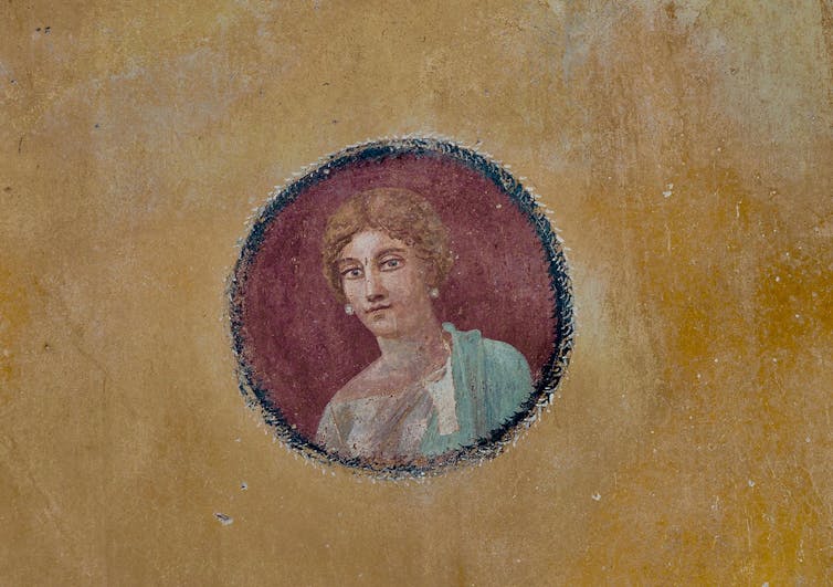 Parmi ces trouvailles, on compte plusieurs fresques extraordinaires. Admirez (en tête de cet article) ce buste d’une jeune Romaine entourée d’une couronne végétale. Elle semble vous fixer à travers un hublot temporel. De grands yeux sans doute cerclés de fard, des cheveux ondulés cachant le haut du front selon la mode de l’époque, une bouche aux lèvres légèrement retroussées, deux grosses perles blanches en guise de boucles d’oreilles… Peut-être la maîtresse de la maison où la fresque a été mise au jour ?