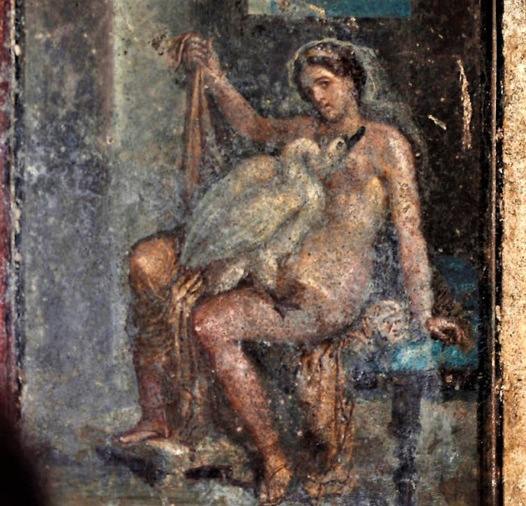 Dans un style plus érotique encore, une peinture montre le viol de Léda, reine de Sparte, par Zeus, le maître de l’Olympe, métamorphosé en cygne.