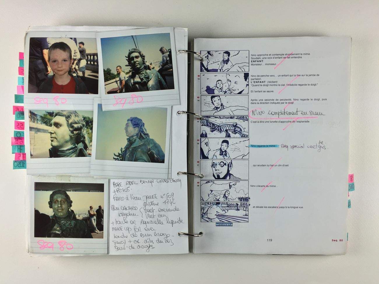 Pour « Le Manège », ils ont fabriqué un petit manège et sculpté de petits bonhommes, qui sont là en bois et en os dans l’expo. Avec dessins, affiches, études de décors, peintures, storyboards, photos… et objets en tous genres, mis en situation avec des extraits de films. Barbe blanche, bonnes joues et bonnet rouge, le nain de jardin du papa d’Amélie est là, dans sa vitrine avec les polaroïds qui prouvent que le petit globe-trotter a bien fait le tour du monde. Plus loin, l’album des photomatons (cahier du générique), le petit cochon lampe de chevet, un cliché d’Amélie sur les marches de la gare de l’Est, et la boîte de Bergamotes de Nancy, dans laquelle Maurice Bénichou émerveillé retrouve ses trésors de gamin, dont les coureurs cyclistes miniatures, qui sont là eux aussi, bien sûr, tout comme la petite musique de Yann Tiersen qui se fait entendre doucement.
