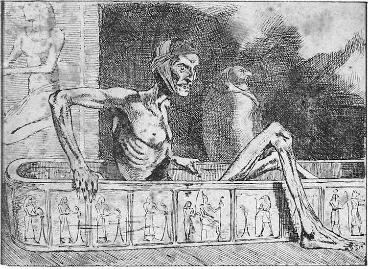 Ainsi, bien avant la découverte du tombeau de Toutankhamon (1922), l’idée de malédiction par une momie vengeresse trouve écho dans la profanation des tombes égyptiennes et l’absence de culpabilité des archéologues qui violent les tombeaux. L’une des plus célèbre momies vengeresses est « The Unlucky Mummy » conservée au British Musuem (BMEA22542) : elle aurait porté malheur à l’ensemble de ceux qui l’ont rencontrée et aurait même, d’après une légende, fait couler le Titanic.
