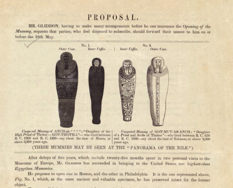 « Ces vénérables vestiges de l’antiquité présentent à l’œil du spectateur une image saisissante de trois mille ans, et constituent incontestablement la plus grande curiosité jamais offerte à un public américain. »