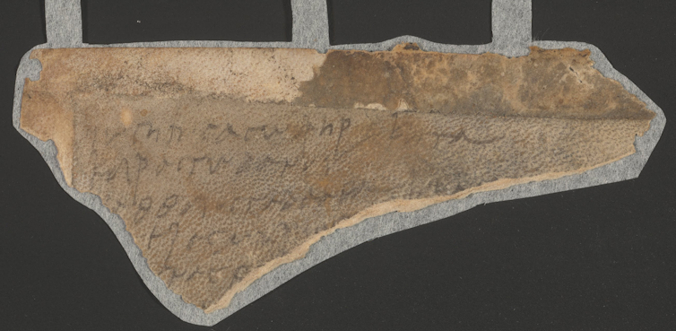 Voici le parchemin nommé Mur 103. Il fait partie d’une archive datée de manière assez imprécise de la fin du Ier siècle ou du début du IIe siècle de notre ère, et il est écrit en grec. Il est sans doute arrivé dans cette grotte durant la révolte de Simon Bar Kokhba, entre 132 et 135, la dernière révolte juive qui s’achève par la suppression de la Judée et la création de la province romaine de Syrie-Palestine.