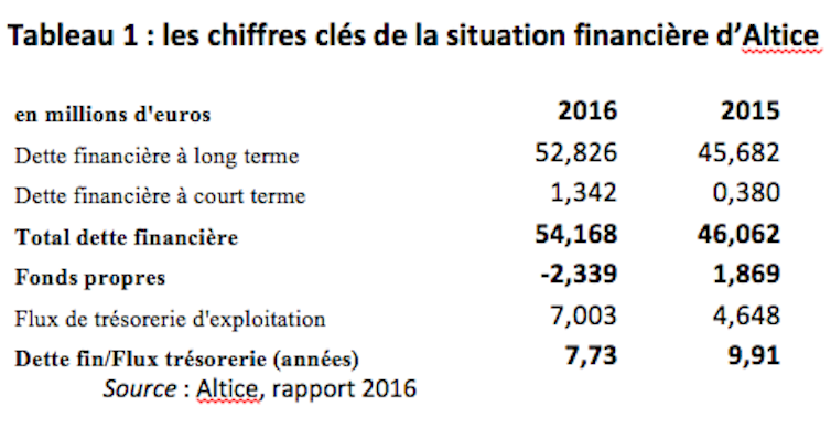 Selon le rapport annuel d’Altice, la dette financière à long terme en 2016 s’élevait à 52,8 milliards d’euros et sa dette financière à court terme à 1,3 milliard ; soit un total de 54,1 milliards d’euros contre 46 milliards en 2015. Sur un an la dette financière totale a augmenté de presque 18 %. Cette dette rapportée au cash généré par l’exploitation qui était de 7 milliards d’euros en 2016 représente donc 7,7 années en 2016 et 9,9 années en 2015.