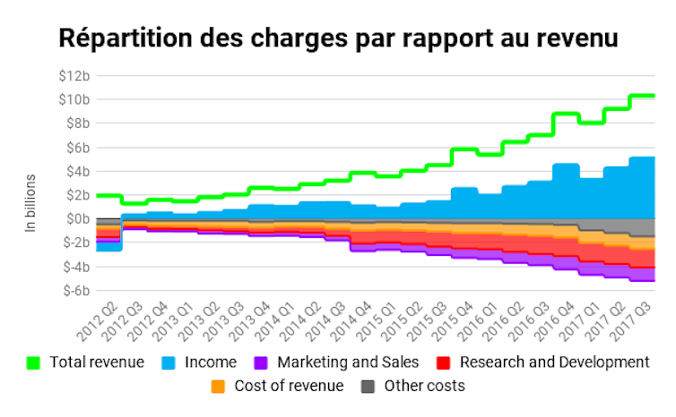 • 27,8 % part en moyens généraux (cost of revenue), ventilés entre l’achat de matériels (serveurs), la construction de nouveaux datacenters et l’emploi de certaines ressources humaines spécifiques. Pour modérer les contenus en circulation, l’entreprise va employer 10000 personnes de plus (via des prestataires), qui viendront se rajouter aux 23000 salariés actuels.