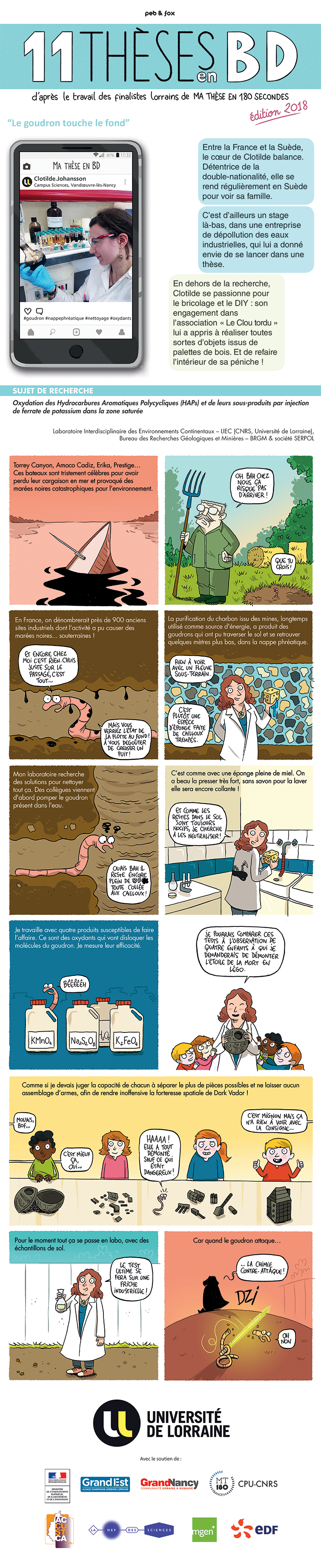 À l’occasion du concours « Ma thèse en 180 secondes 2018 », l’Université de Lorraine propose une adaptation en bande dessinée des travaux de recherche de ses 11 doctorants finalistes. Commandé au duo de dessinateurs Peb&Fox, ce recueil porte un regard teinté d’humour sur une sélection de recherches qui reflètent la diversité des travaux réalisés par les laboratoires lorrains. Les vidéos des prestations des finalistes sont disponibles en ligne). Rendez-vous le 13 juin à Toulouse pour la finale nationale !