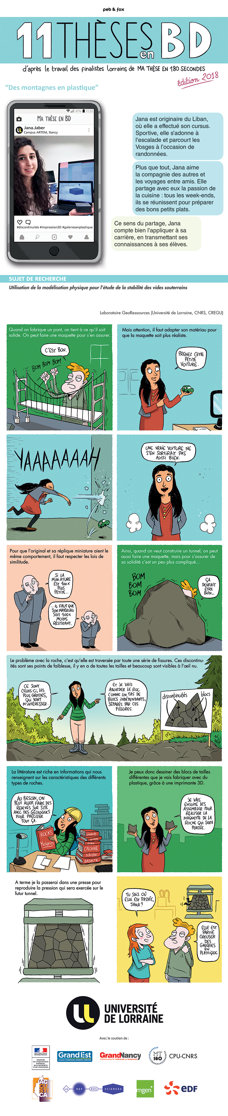 À l’occasion du concours « Ma thèse en 180 secondes 2018 », l’Université de Lorraine propose une adaptation en bande dessinée des travaux de recherche de ses 11 doctorants finalistes. Commandé au duo de dessinateurs Peb&Fox, ce recueil porte un regard teinté d’humour sur une sélection de recherches qui reflètent la diversité des travaux réalisés par les laboratoires lorrains. Les vidéos des prestations des finalistes sont disponibles en ligne). Rendez-vous le 13 juin à Toulouse pour la finale nationale !