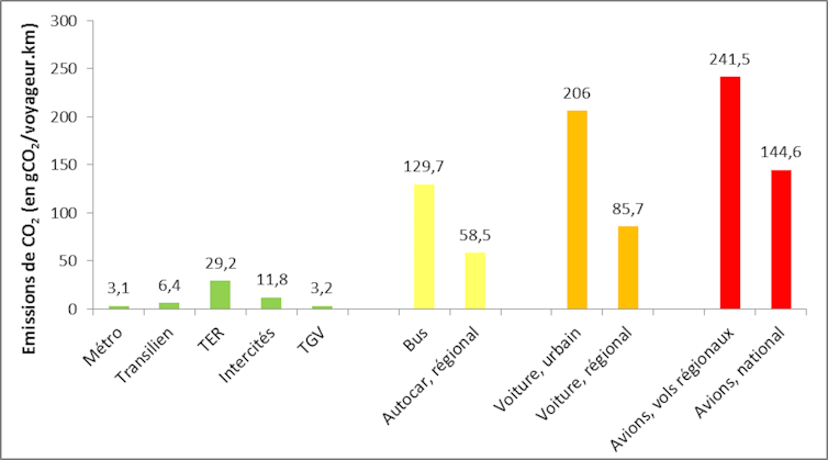 Ces valeurs sont à comparer avec des émissions de 85 à 205g de CO2 pour la voiture particulière, selon le nombre de passagers et les types de parcours.