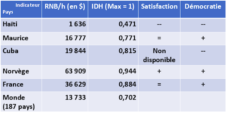 • Mais l’indicateur de démocratie révèle, lui, qu’un pays riche n’est pas nécessairement une démocratie, ou inversement, comme l’illustre le cas de l’île Maurice. Il indique aussi que, s’il y a effectivement une spirale de la misère, du manque d’éducation et de l’instabilité politique en Haïti, un pays non démocratique comme Cuba peut assurer des soins corrects et une éducation convenable.