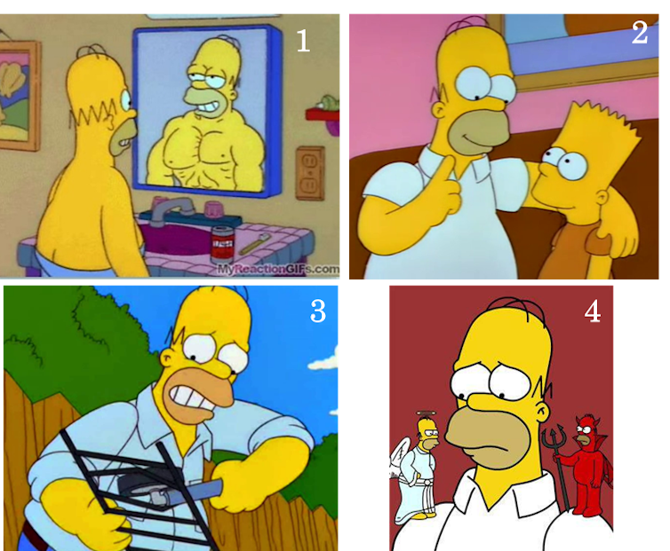 Illustration des biais comportementaux du consommateur à l’aide des Simpson – 1) La sur-confiance (dans sa capacité d’analyse) 2) La survalorisation des informations « saisissantes » (suivre l’avis des proches) 3) L’entêtement (ne pas changer d’avis) 4) L’impartialité (retenir ce qui arrange)