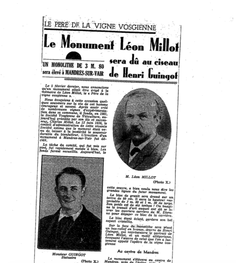Que nous reste-t-il de l’œuvre de Léon Millot par ailleurs fondateur d’une des premières colonies de vacances en France (1888) ? En 1938, l’idée de l’érection d’un monument en sa mémoire a été émise par le conseil d’administration de la Société vosgienne de viticulture. Il s’agissait de rendre hommage à cet homme « de progrès, humaniste, laïc et républicain engagé pour la diffusion des savoirs et la défense de la vigne ». Il faut attendre 1955 pour qu’il soit érigé sur la commune de Mandres-sur-Vair dans les Vosges, son village natal.