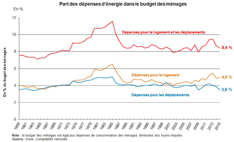En 2016, un ménage habitant en France métropolitaine dépensait en moyenne 1 697 euros pour l’énergie de son logement (principalement pour le chauffage, qui représente 68 % de sa consommation d’énergie, l’eau chaude sanitaire et l’électricité), et 1 131 euros pour l’achat de carburants pour la mobilité. Cette facture énergétique représentait en moyenne 8,2 % du budget annuel d’un ménage.
