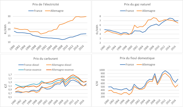 Ces mesures, qui n’ont pour le moment pas semblé convaincre, auraient pour conséquence d’infléchir temporairement la trajectoire des prix de l’énergie qui est à l’origine des protestations. Comme on le voit sur le graphique ci-dessous (qui compare par ailleurs les prix français et allemand), cette trajectoire est repartie à la hausse depuis 2016 en ce qui concerne le gaz naturel, le carburant et le fioul domestique (l’électricité restant plus stable).