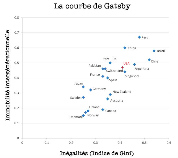L’égalité des chances se réfère à la mobilité. La mobilité intergénérationnelle de revenu interroge la possibilité qu’a un enfant d’accroître facilement ses revenus par rapport à ses parents. Mais on peut aussi la comparer d’une période à l’autre de la vie d’un individu, de manière intragénérationnelle. Combien pourraient, à l’instar de Gatsby le Magnifique – ce personnage, issu d’une famille de fermiers pauvres et devenu millionnaire – se hisser au sommet de l’ascenseur social ? Dans chaque pays, la réponse diffère. Mais une constante traverse un bon nombre de situations. Selon « la courbe de Gatsby », une forte inégalité est liée à une faible mobilité sociale.