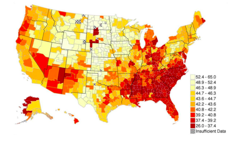 Alors que la Chine se divise nettement entre aires rurales et urbaines, les États-Unis présentent une mosaïque diversifiée. Certains États symbolisent avec force le rêve américain, tandis que les chances de sortir de la pauvreté sont dérisoires dans d’autres.