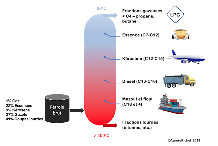 Le pétrole n’est pas directement exploitable : mélange très hétérogène de molécules chimiques, il faut le raffiner. Ces opérations vont permettre de séparer efficacement les composants du pétrole en fractions valorisables tels que des produits non énergétiques (bitume, lubrifiants, etc.) ou énergétiques (diesel, essence, kérosène, mazout de chauffage mais aussi fioul lourd pour le transport maritime).
