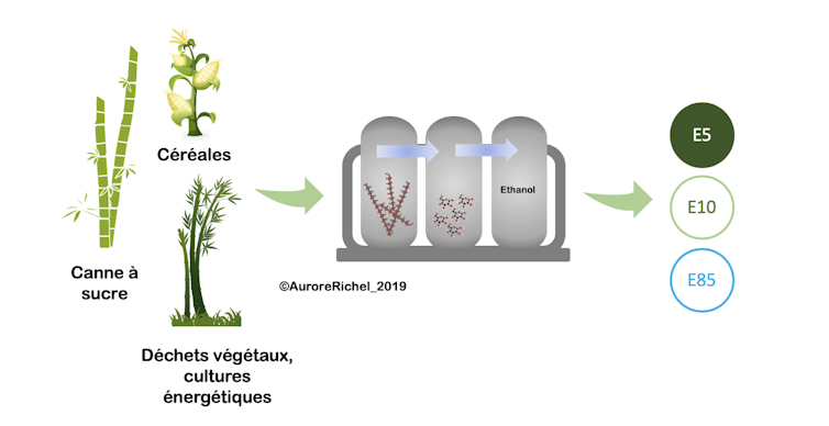 La production de bioéthanol repose sur des ressources végétales qu’elles soient à vocation primaire alimentaire (comme le blé, le maïs, la canne à sucre) ou non (cultures dédiées comme le miscanthus, le bois, les déchets agricoles, etc.). On fabrique ce carburant grâce à une fermentation de certaines molécules renouvelables (de type « sucres ») contenues dans ces ressources végétales permettant d’obtenir de l’éthanol. À la pompe, l’indication E10 fait ainsi référence à une essence contenant 10 % en volume de bioéthanol.
