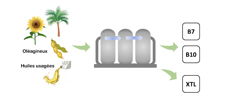 Illustration schématisée de la production de biodiesel au départ de la biomasse ou d’huiles usagées.