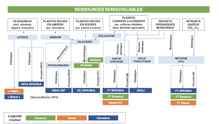 Certains kérosènes sont ainsi produits grâce à des plantes riches en sucres (comme la canne à sucre) tandis que certains autres reposent sur la transformation d’huiles (algues, plantes oléagineuses). Certains kérosènes sont produits par le procédé de Fischer-Tropsch et pourraient être obtenus au départ de CO2 et de H2, tandis que d’autres s’orientent vers l’utilisation de micro-organismes novateurs dans des approches de fermentation (la voie biochimique du schéma). En fonction des flux de manières premières renouvelables dans certaines zones du globe (on pense à l’abondance de la cane à sucre au Brésil), certaines entreprises manufacturent donc des kérosènes différents.