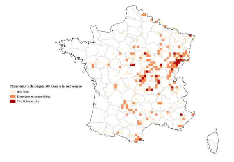Les régions françaises ne sont pas toutes touchées de la même façon. Certaines semblent plutôt épargnées jusqu’à maintenant, d’autres complètement dévastées, notamment par des perturbations secondaires favorisées par la sécheresse. Le manque d’eau rend les peuplements vulnérables à d’autres aléas, comme l’incendie (notamment en zone méditerranéenne) ou encore les attaques d’insectes et de champignons.