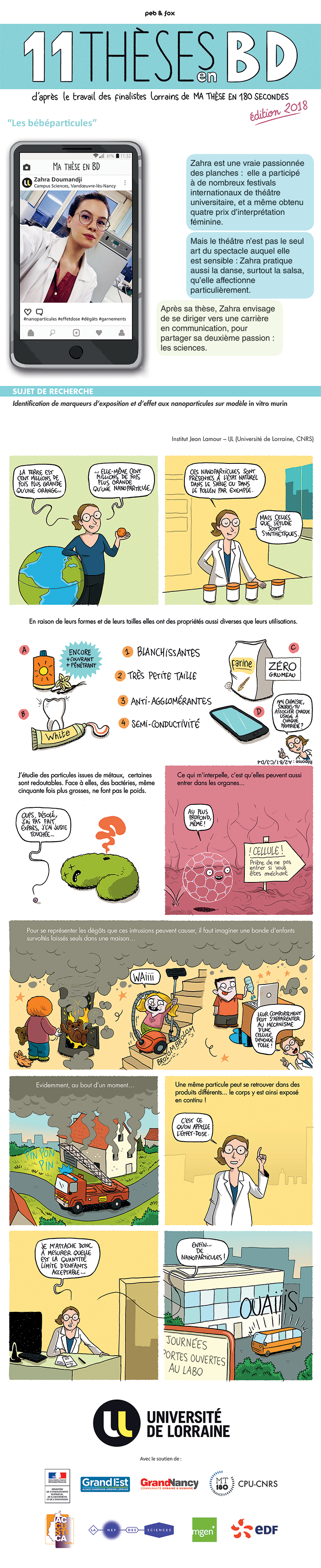 À l’occasion du concours « Ma thèse en 180 secondes 2018 », l’Université de Lorraine propose une adaptation en bande dessinée des travaux de recherche de ses 11 doctorants finalistes. Commandé au duo de dessinateurs Peb&Fox, ce recueil porte un regard teinté d’humour sur une sélection de recherches qui reflètent la diversité des travaux réalisés par les laboratoires lorrains. Les vidéos des prestations des finalistes sont disponibles en ligne). Rendez-vous le 13 juin à Toulouse pour la finale nationale !