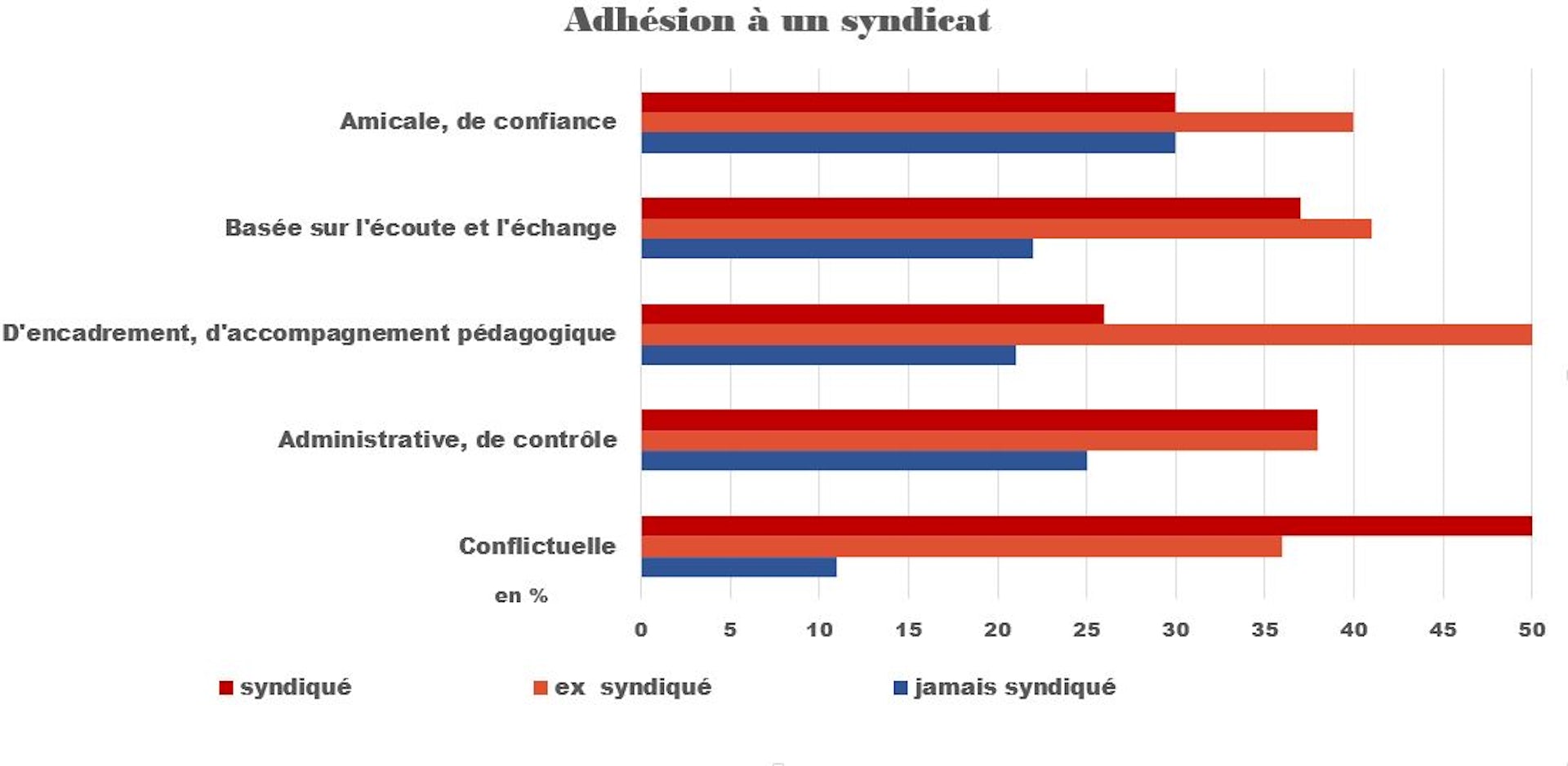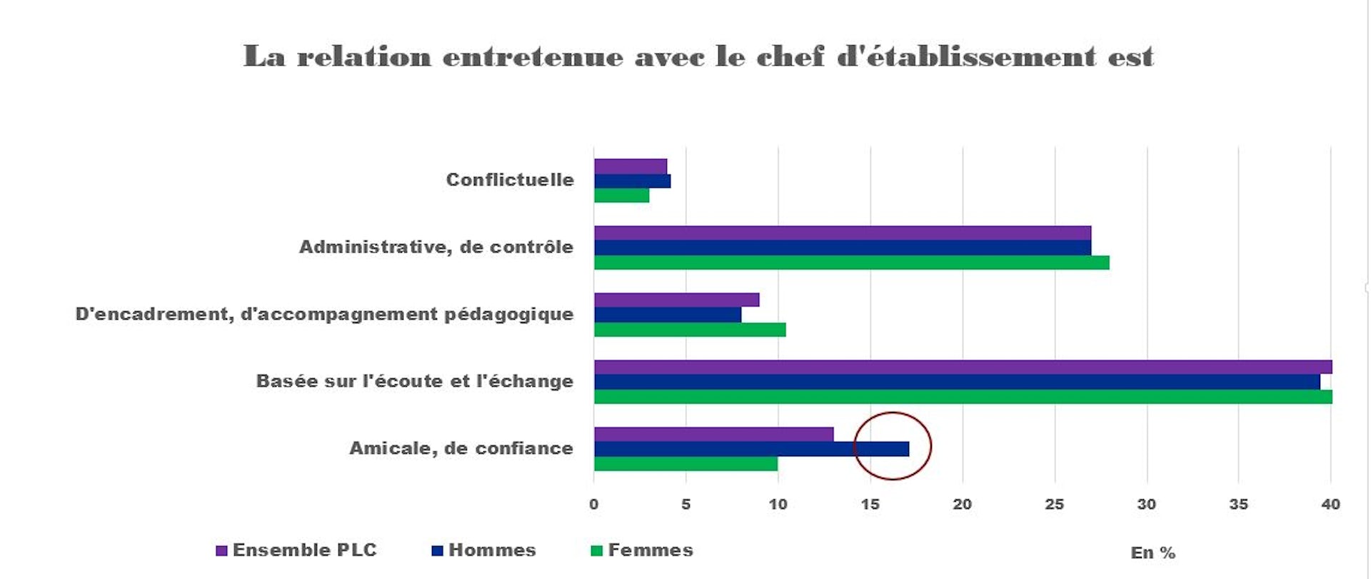 Quand on demande aux professeurs de qualifier leur lien avec leur chef d’établissement, ils sont 31 % seulement à afficher des sentiments anti-hiérarchiques, jugeant cette relation « conflictuelle » ou « administrative, de contrôle ». Cette dernière modalité, soit 27 % des réponses, peut autant indiquer une indifférence – renvoyant à un rapport purement bureaucratique au chef – qu’une certaine défiance, faisant référence à un éventuel sentiment de surveillance, par exemple. À l’opposé 54 % des enseignants emploient un vocabulaire positif, évoquant une relation soit « basée sur l’écoute et l’échange », soit « amicale, de confiance ».
