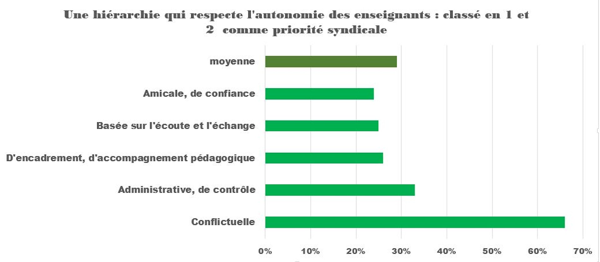 La profession ne pense d’ailleurs pas que la problématique hiérarchique revête un caractère impérieux, malgré la persistance de rumeurs attribuant au nouveau ministre la volonté de renforcer les pouvoirs des chefs d’établissement. Lorsqu’on demande de classer les revendications syndicales prioritaires, la proposition « une hiérarchie qui respecte l’autonomie des enseignants » ne suscite pas un enthousiasme débordant.
