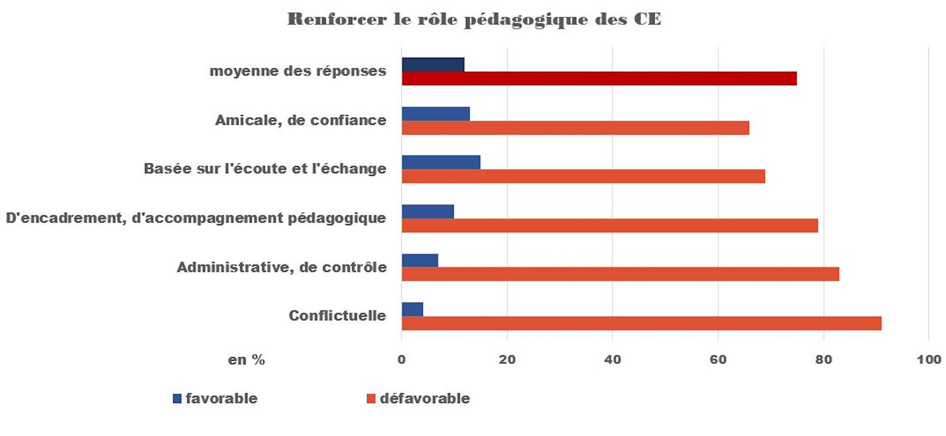 Mais lorsque l’on passe de cette observation du vécu aux principes généraux, le ton change : les professeurs s’opposent massivement à l’idée de « renforcer le rôle pédagogique des chefs d’établissements (visites dans les cours, notation pédagogique…) ». 44 % y sont très défavorables et 28 % plutôt défavorables. Ce consensus contre une éventuelle extension du pouvoir de la hiérarchie provient notamment de l’embarras que celle-ci éprouve lorsqu’il faut satisfaire la demande d’accompagnement exprimée par le personnel.