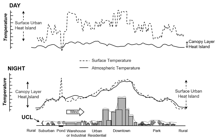 Le paysage urbain est, la plupart du temps, pavé et sans végétation. Ce qui signifie qu’il y a peu d’eau disponible pour l’évaporation ; l’énergie naturelle est ainsi majoritairement utilisée pour chauffer les surfaces. Les matériaux de construction sont denses, et nombre d’entre eux – tout particulièrement les surfaces aux couleurs sombres comme l’asphalte – absorbent et conservent très bien la chaleur du soleil.