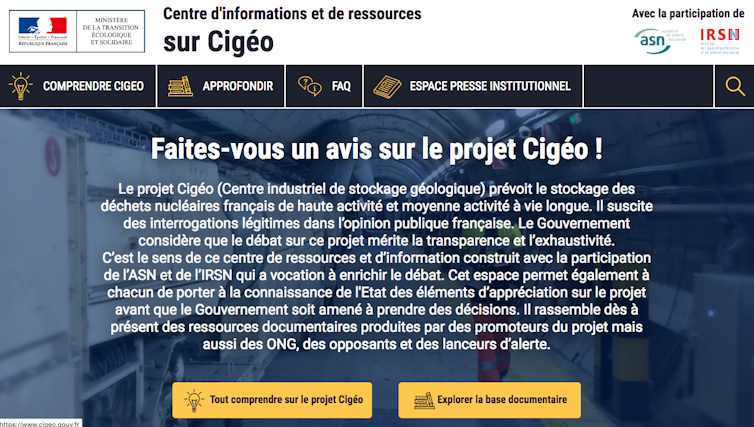 Ce portail d’informations opère une rupture sur le plan de l’énonciation. Encore récemment, c’est l’Andra qui diffusait les informations sur le projet Cigéo : son calendrier, son budget, ses risques, etc. Désormais, c’est le plus haut niveau de la représentation politique qui s’exprime. L’Andra n’est plus seule à endosser la responsabilité du stockage des déchets nucléaires. Le gouvernement explique pourquoi la France s’est engagée dans le projet, quelle sera la durée de vie du site, ou encore son impact sur la santé des habitants et l’agriculture locale.