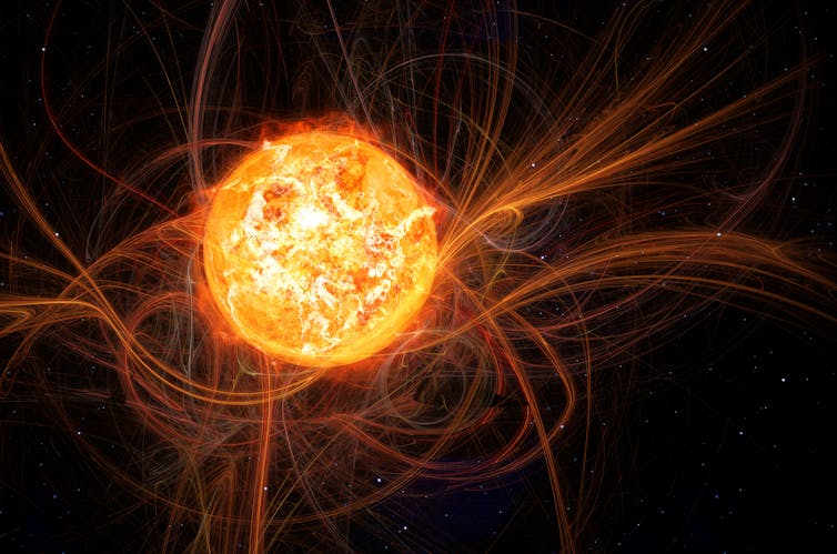 Comme la Terre, le Soleil possède un champ magnétique. Imaginons le champ magnétique comme étant des lignes invisibles reliant les pôles nord et sud d’une étoile ou d’une planète.