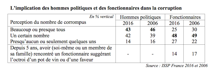 Mais cette dénonciation – normale – par les médias n’entraîne pas chez tous les citoyens le même jugement pessimiste sur la moralité des élus. Nous allons mettre en évidence certains ressorts favorisant la croyance en la corruption des élus et des fonctionnaires à l’aide de l’enquête de l’International Social Survey Programme(ISSP), réalisée en France en 2016, et reprenant des questions identiques de 2006.