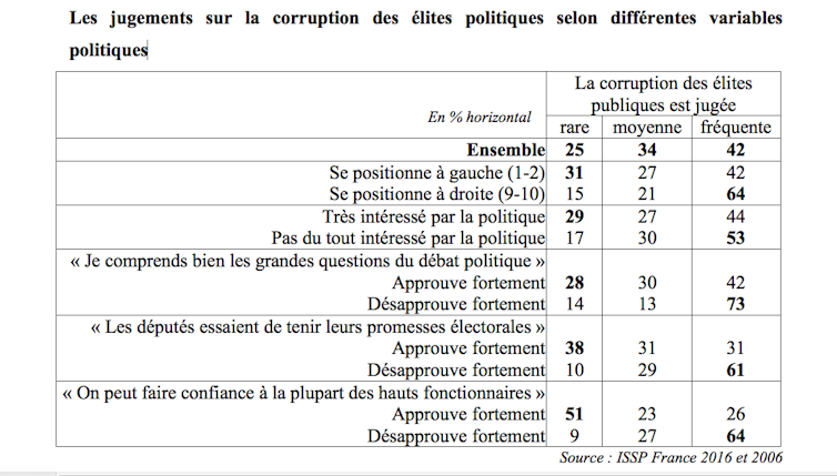 La croyance très répandue en la corruption des hommes politiques tient, évidemment, à l’existence de certains scandales bien réels, qui sont fortement médiatisés et réprouvés par les opinions publiques. Mais la force et l’étendue de cette croyance dépendent fortement de ce que sont les individus. Les catégories populaires, les gens plus éloignés du monde de la politique, les personnes proches de la droite radicale et plus critiques à l’égard des élites, sont aussi beaucoup plus souvent croyantes en leur corruption.