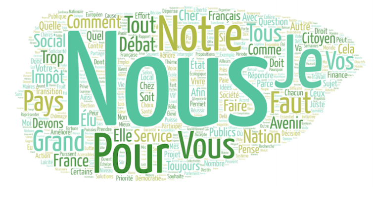 Une analyse sémantique des mots utilisés par Emmanuel Macron dans sa lettre, par la technique des nuages de mots, permet clairement de voir que la trame narrative essentielle de cette lettre est la tentative de faire renaître de ses cendres ce « nous » collectif et de colmater la brèche gigantesque qui s’est creusée entre l’appel à la réconciliation nationale que contenait le projet présidentiel et sa mise en œuvre. Mais on voit aussi que le mode personnel du je – volontaire et vertical – est toujours là, également…