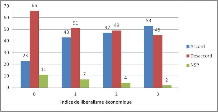 Mais autoritarisme et libéralisme économique ne sont pas antinomiques. En effet, les enquêtés qui sont fortement autoritaires sont très libéraux sur le plan économique à concurrence de 54 % contre 44 % chez ceux qui sont faiblement autoritaires. On voit clairement dans ces résultats que le libéralisme économique peut très bien s’associer au rejet de la démocratie représentative ordinaire au point de préférer des experts ou des dirigeants forts à des assemblées élues.
