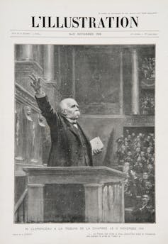 Georges Clemenceau à la tribune de la Chambre des députés le 11 novembre 1918 (L’Illustration).