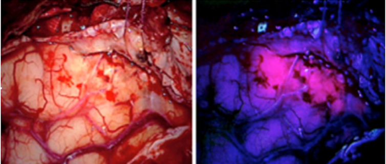 Pour le traitement du glioblastome, cancer du cerveau au pronostic très sombre, un essai clinique a été mis en place en mai 2017 à Lille. A ce jour 9 patients ont été traités par thérapie photodynamique. La technique consiste à faire boire au patient, 5 heures avant l’intervention chirurgicale, une substance qui va permettre de guider le neurochirurgien lors de la résection de la tumeur. En effet, cette substance est spécifiquement accumulée dans les cellules tumorales. Au bloc chirurgical, le chirurgien utilise son microscope avec une lumière bleue afin de mieux voir la tumeur qui apparaît en rose. Un ballonnet, développé par l’unité Oncothai, est ensuite introduit dans la cavité obtenue après chirurgie. Une illumination en lumière rouge permet alors de détruire alors les cellules tumorales résiduelles situées en périphérie de la cavité. Il faut souligner que c’est la première fois que la PDT est proposée en première intention thérapeutique pour le glioblastome. Jusqu’à maintenant, les quelques essais réalisés étaient proposés après récidive.