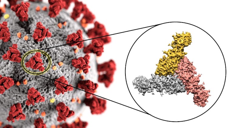 Plus spécifiquement, ce que l’on peut voir sur cette image est une partie de la couronne du virus, un ensemble de protéines nommées spike. En fonction du virus, la forme et la composition de sa surface varie. C’est l’une des raisons pour lesquelles la recherche de nouveaux vaccins est un travail difficile. Les trois couleurs visibles sur l’image montrent que la couronne est constituée de trois protéines identiques entremêlées. Il est possible de connaître la position de chaque atome qui compose ces spikes, ce qui permet de comprendre les mécanismes d’infection des virus. C’est pourquoi en plus d’être une prouesse technologique, la connaissance de cette structure aide la recherche de nouveaux vaccins ou de voies de traitements des maladies virales.