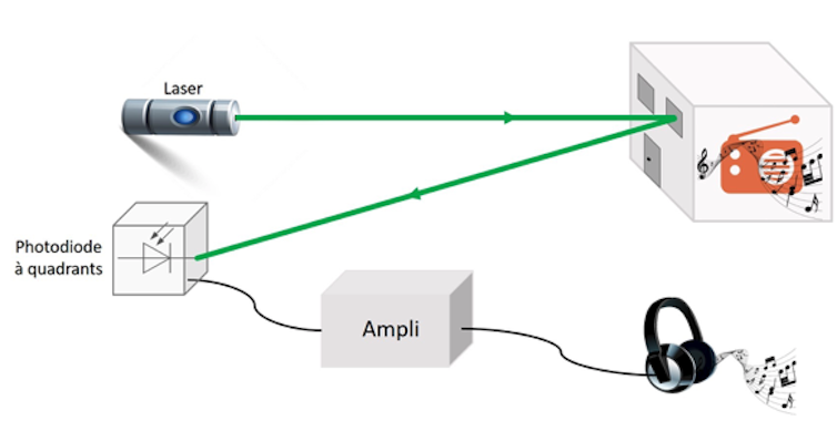 Une boîte en plexiglas représentant la pièce à « espionner » contient une radio, « conversation à écouter », qui joue de la musique que l’on ne peut pas entendre à l’extérieur de la boîte. Un faisceau laser se réfléchit sur la paroi de la boîte qui vibre au rythme de la musique. Les variations dans la direction du faisceau réfléchi sont détectées par une photodiode à quadrants dont le signal électrique est retranscrit en onde sonore via un système d’amplification et un casque qui restitue bien la musique jouée.