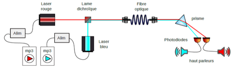 Pour illustrer la transmission d’informations sur de longues distances via la lumière, nous présentons une expérience de « multiplexage » analogique). Deux informations (deux chansons différentes) se propagent sans brouillage dans la même fibre optique grâce au codage du son par les variations d’intensités lumineuses d’un laser rouge et d’un laser bleu qui constituent deux canaux de transmission. En sortie de fibre, un système optique dispersif (prisme, réseau de diffraction) permet de séparer les deux faisceaux de couleurs différentes et de récupérer chaque canal d’information sur une photodiode reliée à un casque audio. Les visiteurs du stand peuvent vérifier qu’en occultant l’un des deux lasers la transmission sur l’autre voie se fait sans altération !
