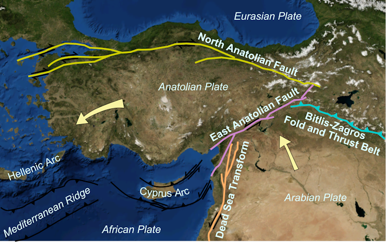 La très belle ville d’Istanbul est bâtie en bordure de deux plaques continentales qui coulissent continuellement l’une par rapport à l’autre. Au Nord, la plaque européenne limitée au sud par la mer de Marmara et la baie d’Izmit vers l’Ouest. Au Sud, le bloc anatolien. C’est le domaine de la faille Nord Anatolienne (NAF) qui s’étend sur plus de 1 200 km vers l’Est, et qui se déplace de 2,5 cm/an vers l’Est, par rapport à la plaque Europe, stable. Les séismes sont fréquents au long de cette faille, avec une récurrence d’une dizaine d’années et un déplacement des séismes vers l’Ouest.