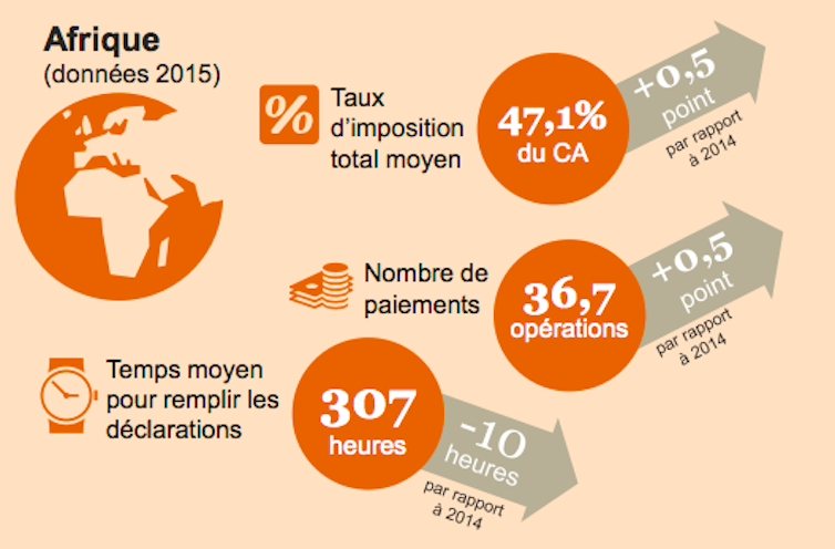 Au Sénégal par exemple, le taux d’imposition moyen sur les entreprises s’établit à 48 % alors que la pression fiscale au Sénégal se situe à environ 20 % (Pricewaterhouse Coopers et World Bank, « Paying taxes 2016 : Ten years of in-depth analysis »). Ainsi la faiblesse des recettes fiscales des pays africains par rapport à la taille de leur économie s’explique essentiellement par l’étroitesse de leurs assiettes fiscales. Par ailleurs, la pression fiscale exercée sur le secteur privé, principale source des recettes fiscales, est trop forte par rapport aux pratiques dans le reste du monde et pourrait contribuer à affaiblir la capacité des États à élargir l’assiette fiscale.