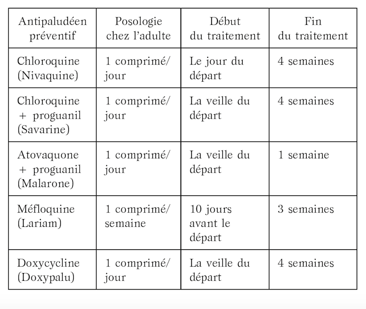 Second niveau de protection : comme on n’est jamais sûr de ne pas être piqué sans s’en apercevoir, un ou deux mois de traitement préventif par les médicaments, appelé chimioprophylaxie, valent mieux que… vingt ans de paludisme. Les traitements préventifs obtenus sur prescription médicale varient en fonction des zones visitées, de la durée du voyage et de l’âge de la personne. Les médecins les connaissent et choisiront celui adapté à votre cas. Certains doivent être pris avant le départ.
