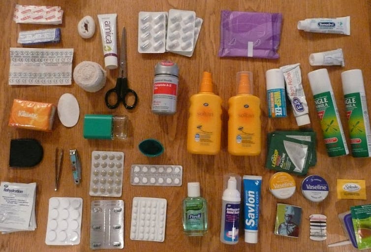 Quelle que soit la destination, il convient d’emporter avec soi une trousse contenant quelques médicaments « passe-partout » : paracétamol, antidiarrhéique type lopéramide (Imodium), antiallergique (antihistaminique H1), antiseptique cutané (PVP iodée c’est à dire Bétadine), collyre antiseptique (monodose), sachets de réhydratation orale, sérum physiologique, crème pour les brûlures, pansements stériles, bande de contention, gel ou solution hydroalcoolique pour l’hygiène des mains, produit de désinfection de l’eau de boisson ou de rinçage des dents.