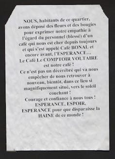 Les attentats qui ont frappé la France cette dernière décennie ont donné lieu à de nombreux ouvrages tentant de comprendre, décrypter et analyser le phénomène djihadiste, la terreur et les émotions qui ont accompagné ces événements. Alors que s’ouvre le procès des attentats du 13 Novembre 2015, The Conversation publie un extrait de l’ouvrage dirigé par Sarah Gensburger et Gérôme Truc, consacré à la mémoire de ces attentats, et intitulé Les mémoriaux du 13 novembre, Paris, Éditions de l’EHESS, 2020, et plus particulièrement un texte de Gérôme Truc issu du chapitre 4, « Ce que disent les messages du 13 novembre ».