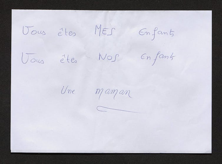 Leurs messages, qui représentent 1,5 % du corpus, sont restés dans les mémoriaux jusqu’à ce que les Archives de Paris les collectent. C’est vrai également des messages en arabe, qui sont au nombre de 60, ce qui en fait l’une des langues étrangères les plus présentes, au même niveau que l’allemand, juste après l’anglais, l’italien et l’espagnol.